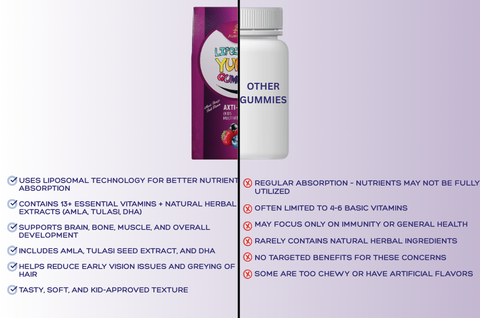 Axti-Kid uses liposomal technology to improve absorption and effectiveness. It also contains a unique blend of 13+ essential nutrients plus herbal extracts like Amla and Tulasi Seeds for immunity and growth.