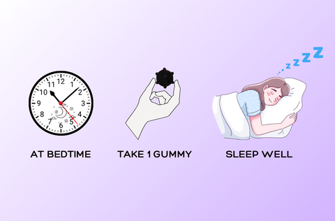 Take one gummy 30 minutes before bedtime. Try to take it at the same time every night to help your body adjust and create a stable sleep routine. Avoid Tv, Phone and bright lights.